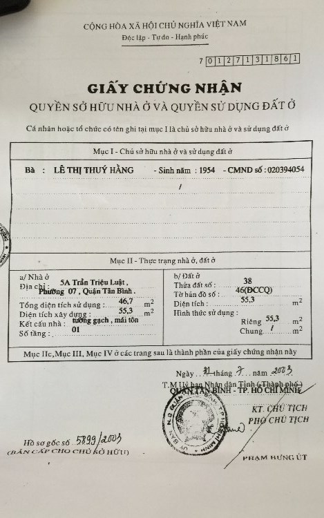 Nhà cấp 4 tiện xây mới đường Trần Triệu Luật (Lý Thường Kiệt quẹo vào), phường 7 quận Tân Bình diện tích 5 x 11.1 = 55.3 m2. Giá 5 tỷ 500. Tiếp người thiện chí.