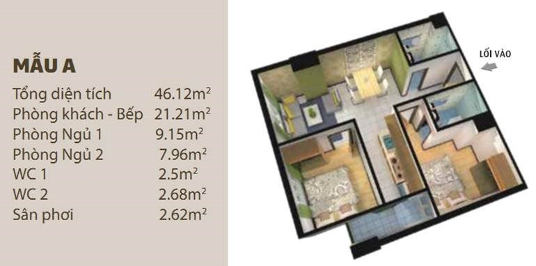Diện tích từ 46 - 69 m2, rất phù hợp cho những gia đình trẻ, mật độ căn hộ mỗi sàn thấp, chỉ 8 căn/sàn và 2 thang máy. Mật độ xây dựng thấp, hệ thống công viên xanh tạo cảnh quan đẹp cho dự án.