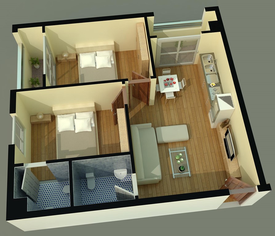 Có 3 loại căn hộ: 57,6m2, 64,6m2 & 64,8m2, 2 phòng ngủ, 2 nhà vệ sinh, 2 ban công và 1 nhà kho trên không miễn phí 4m.